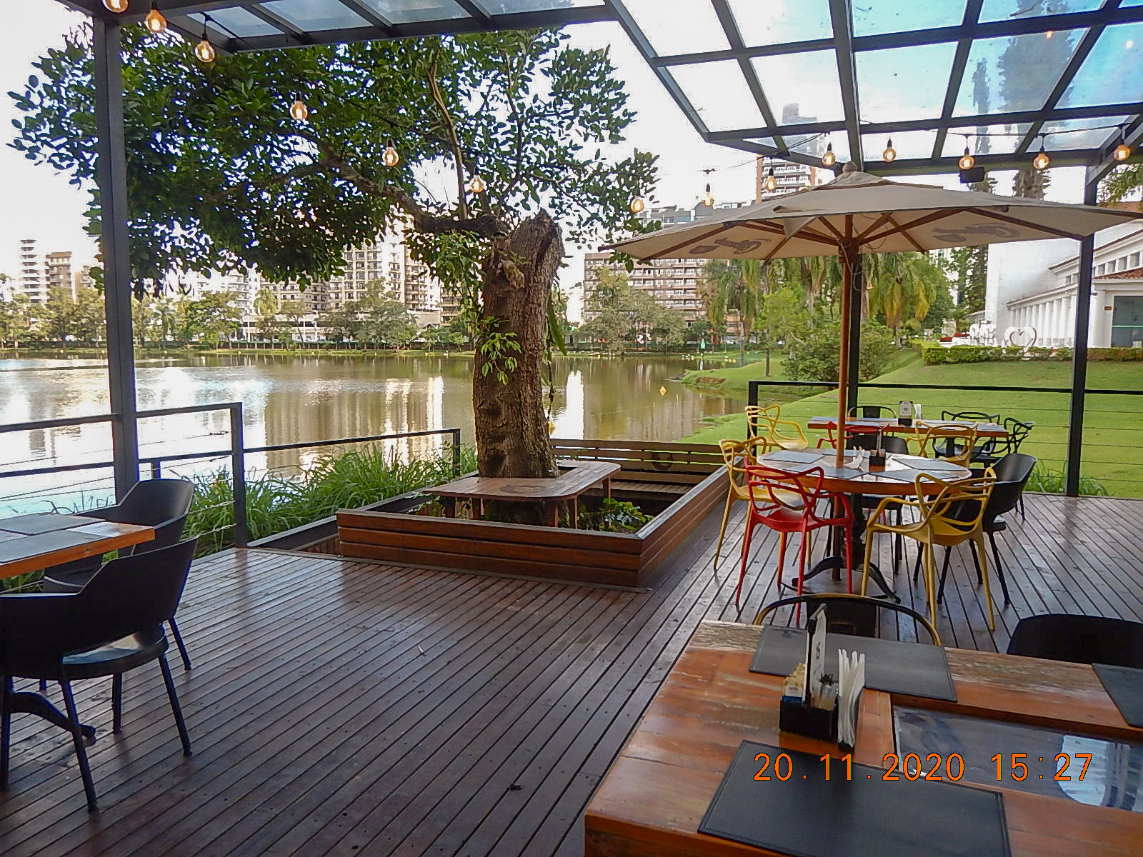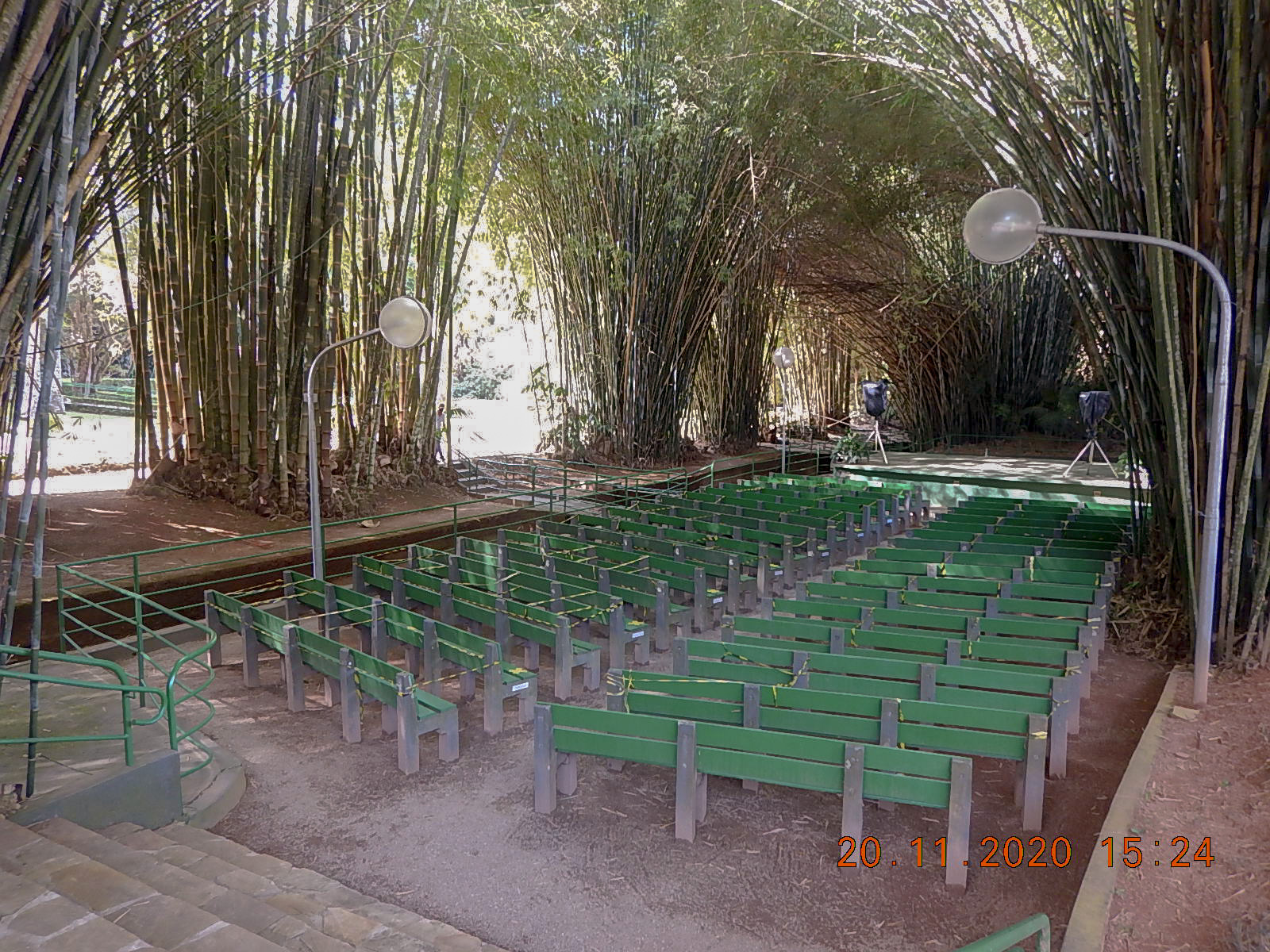 Um auditório foi criado sob o bambuzal para apresentações teatrais, musicais e até a realização de casamentos. O ambiente chega a ser mágico pela sensação que nos proporciona. É lindo!