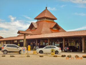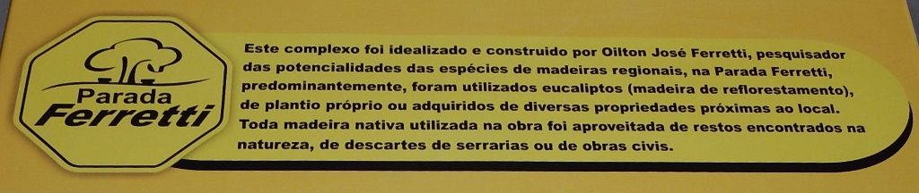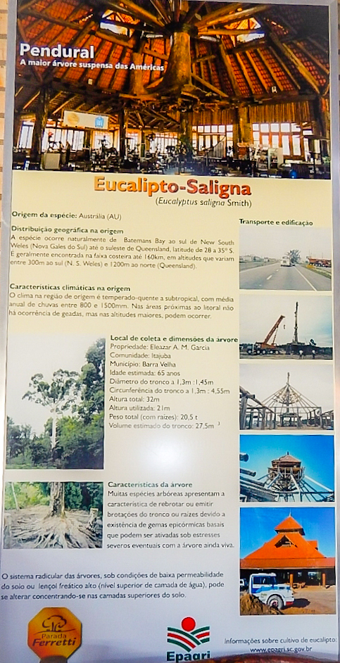 A localidade é Barra Velha, localizada entre Itajaí e Joinville, no km 91,5 da BR 101. Impossível passar direto e deixar de ver aquele monumento imenso, fantástico, totalmente estruturado em eucalipto, instalado com engenho e arte como se estivesse pendurado no teto do Café/restaurante. Se a idéia era esta, acertaram em cheio.