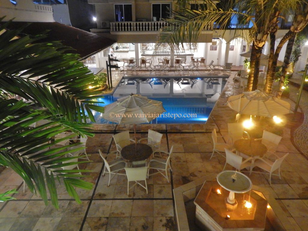 FOTO DESTACADA – Em primeiro plano vê-se a praça que marca o centro da Villa; ou seja, o centro do hotel, que prima pela originalidade de sua arquitetura. Em último plano, sob a luz branca, fica o local onde é servido o farto e saboroso café da manhã.