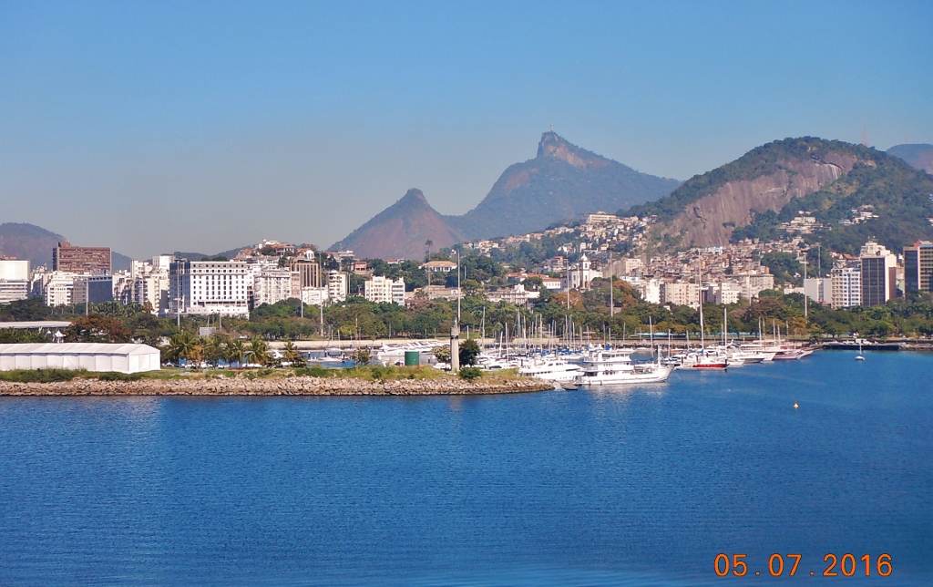 Em primeiro plano, a Marina da Glória. À esquerda, escombros do prédio do Hotel Glória (o quadrado branco). À direita, o Corcovado.