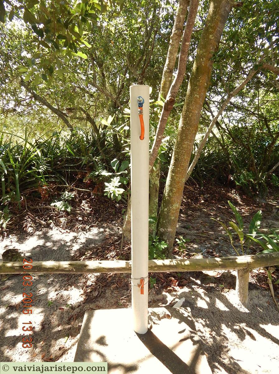 Antes do estacionamento há uma torneira muito bem arquitetada à disposição: além de economizar água devido ao sistema de bombeamento, só permite a limpeza de pés porque a saída da borracha é baixa, curta, está presa e direcionada unicamente para baixo. Dê uma olhada na sábia engenharia, uma pegadinha que funciona.