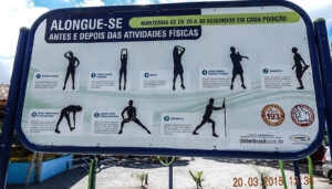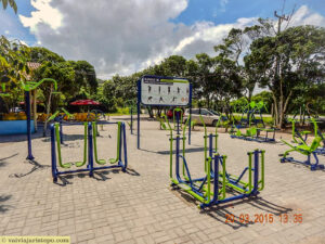 Estacionamento, restaurante e área de exercícios estão logo à direita, na entrada do parque.