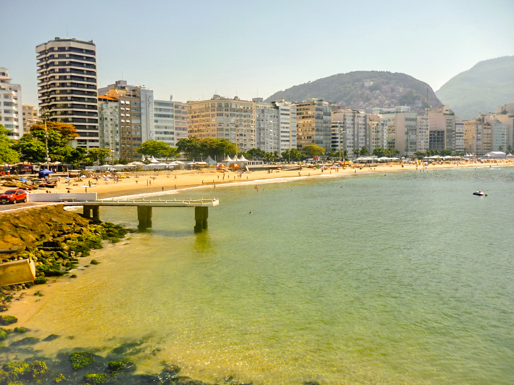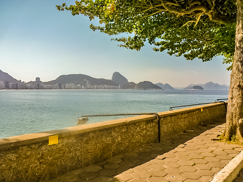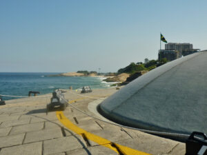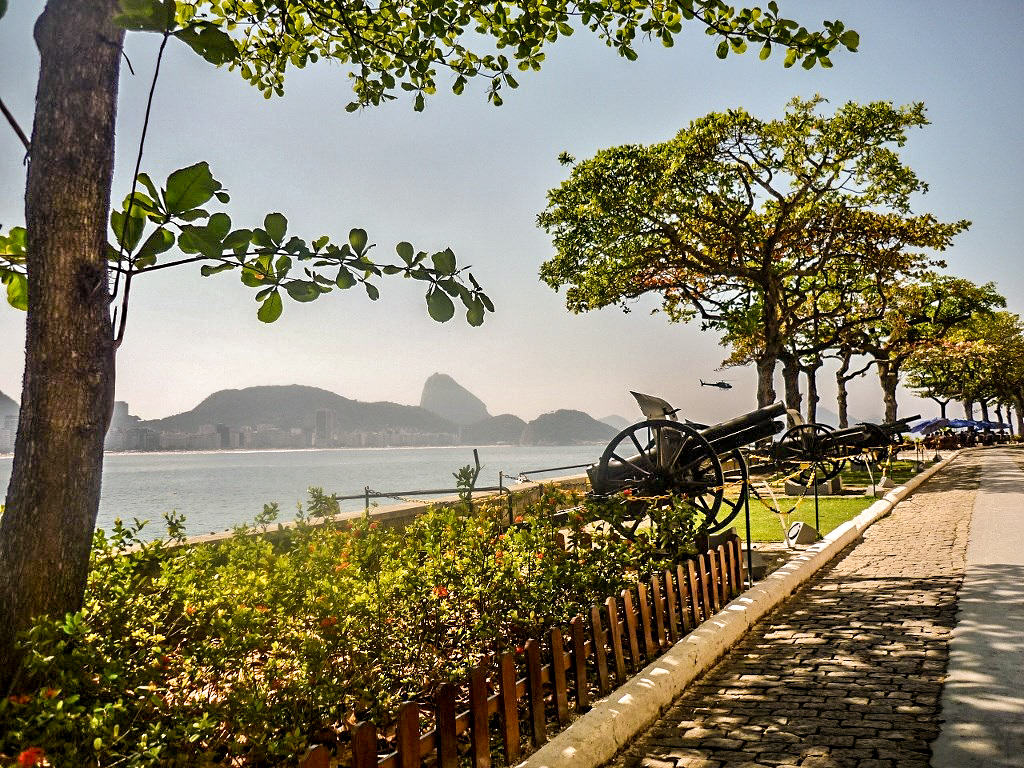 À esquerda temos o Morro do Cantagalo e à direita, a Entrada do Forte de Copacabana