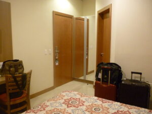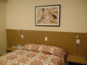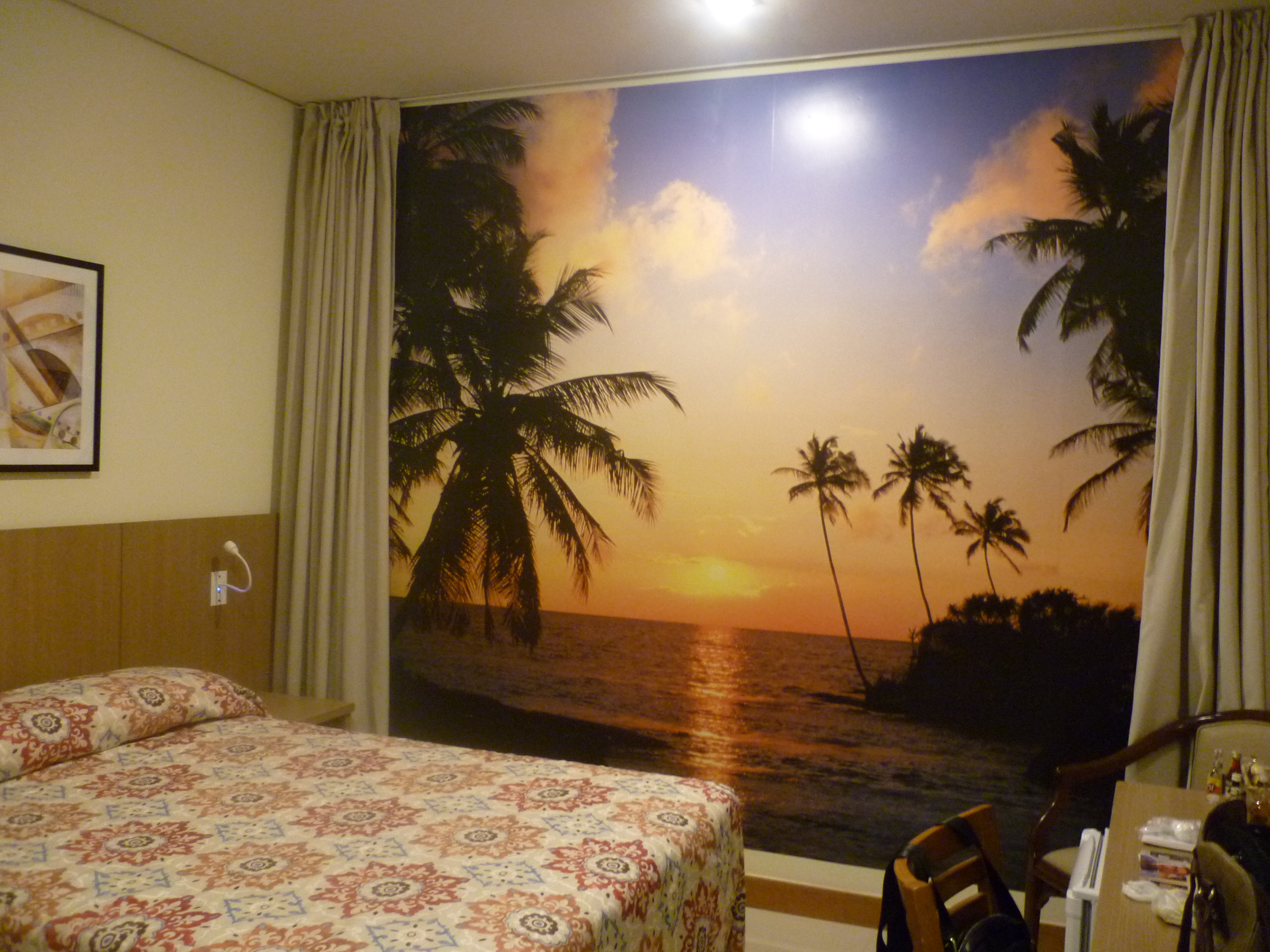Desta vez ficamos em um quarto menor. Como não há janelas, uma das paredes em cada quarto é forrada com um painel decorativo. A foto desse aposento é essa que você vê abaixo.