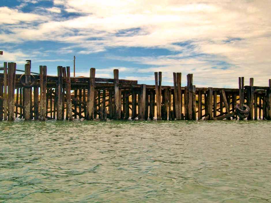 Ao chegarmos ao pier da salina perguntei pelas varas de pesca, iscas, essas coisas. Não havia. O esquema era outro: equipados com arpão, máscaras e snorkels, ambos mergulhavam na tentativa de pescar alguma coisa para o almoço, mas estava difícil – neste dia, para decepção de todos, o mar não estava prá peixe.