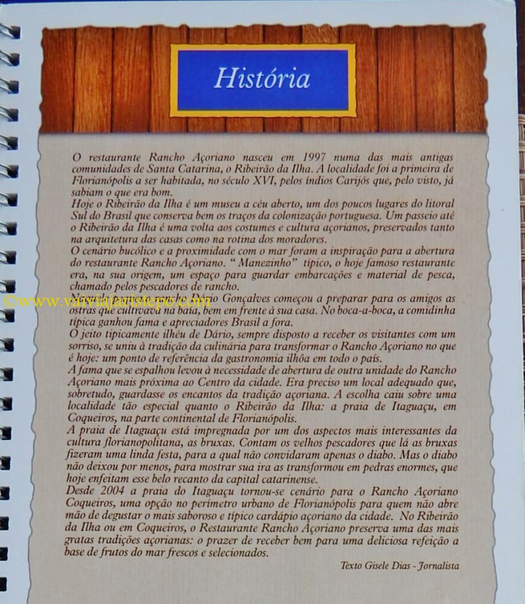 A idéia de os restaurantes contarem um pouco de sua trajetória nas primeiras páginas do cardápio é uma feliz idéia. Lembra-me álbum de retratos em que fotos mostram como éramos quando crianças e como fomos ficando com o passar dos anos. E o Rancho Açoriano, tal qual uma pessoa que fica mais bela quando envelhece, não fugiu a essa regra. A comparação pode lhe parecer um tanto inadequada, mas faz sentido quando você se inteirar de sua história.