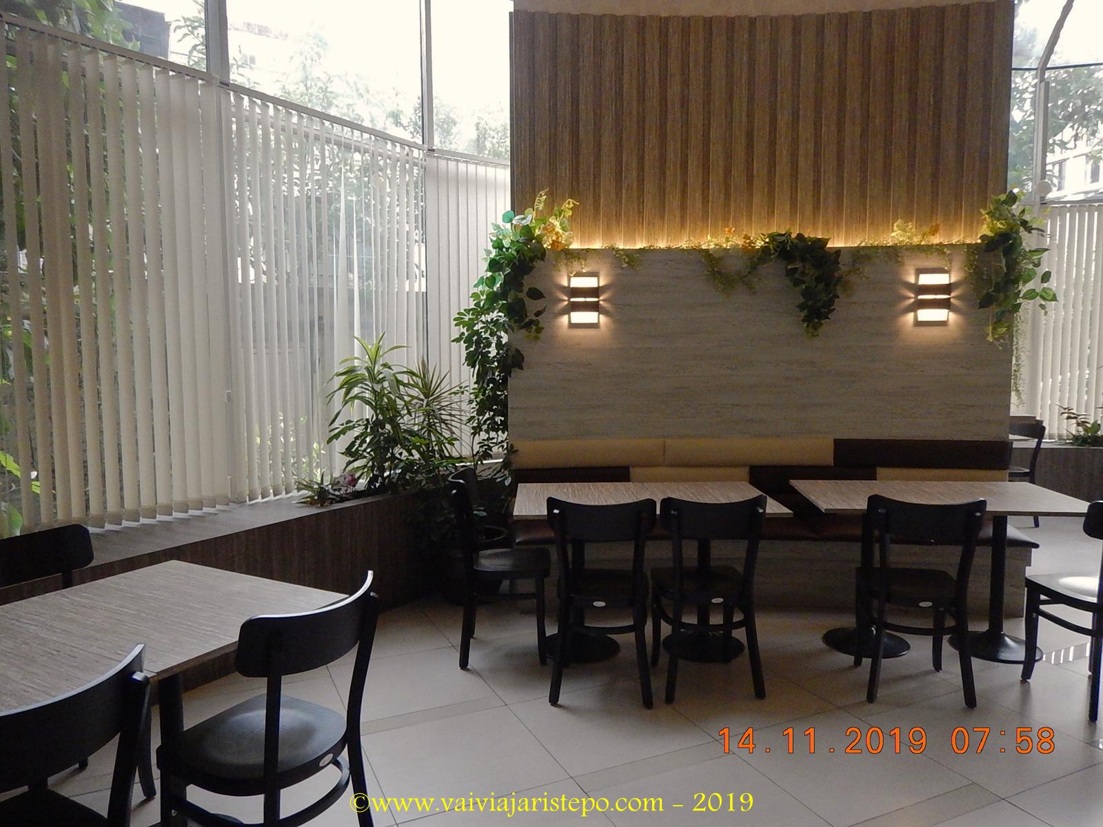 À exceção das imagens da recepção, do estar, e do lugar onde servem o café da manhã, as demais fotos publicadas em conceituado site de reserva de hotéis não mostram a realidade dos quartos mais simples.