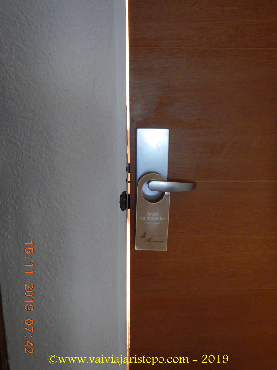 O Hotel Montecarlo que aparece em fotos de divulgação não corresponde à realidade. Na foto acima, vê-se o estado deplorável da porta do banheiro e do revestimento do box. O quarto era repulsivo. Pedimos para mudar, mas não nos atenderam.