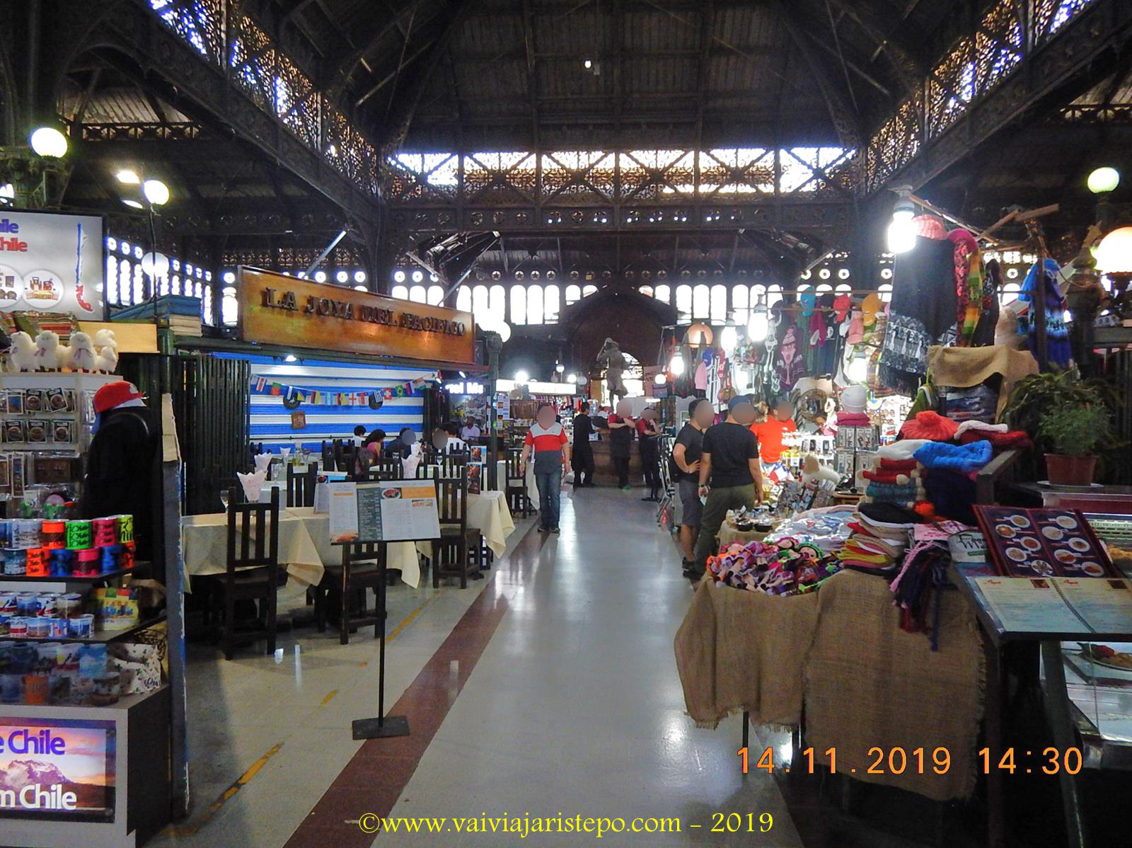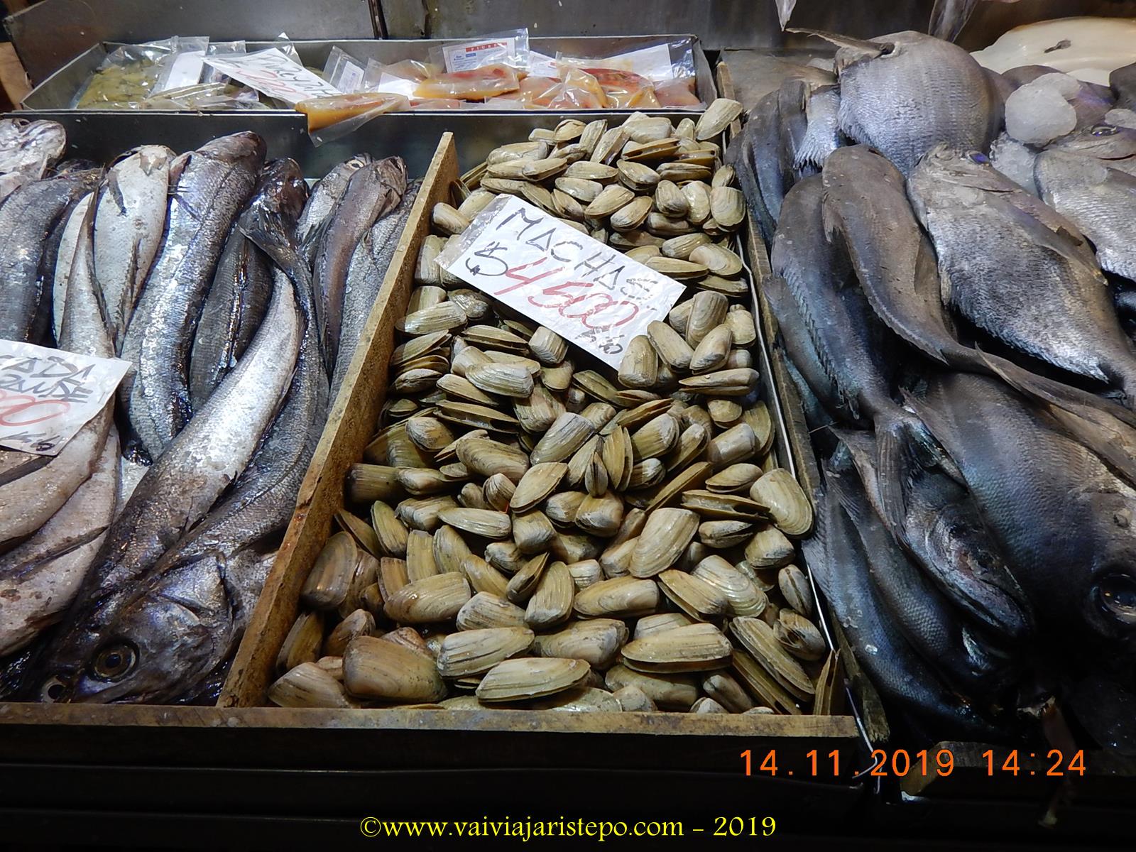 Não parece, mas nesse mercado há mais de 240 lojas ocupadas por comerciantes de artesanatos, fiambreria, queijos, frutas, legumes, verduras, condimentos, carnes e… peixes e frutos do mar. Almejas, machas e locos, por exemplo, ainda são desconhecidos aqui no Brasil.