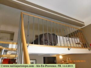 O apartamento que havíamos alugado no mesmo prédio em 2013 não era tão amplo e houve um pormenor que nos dificultou bastante: uma escada com degraus para um apenas um pé, do tipo daquela existente na casa de Santos Dumont, em Petrópolis. Esta escada perigosa leva ao mezanino onde fica a cama.