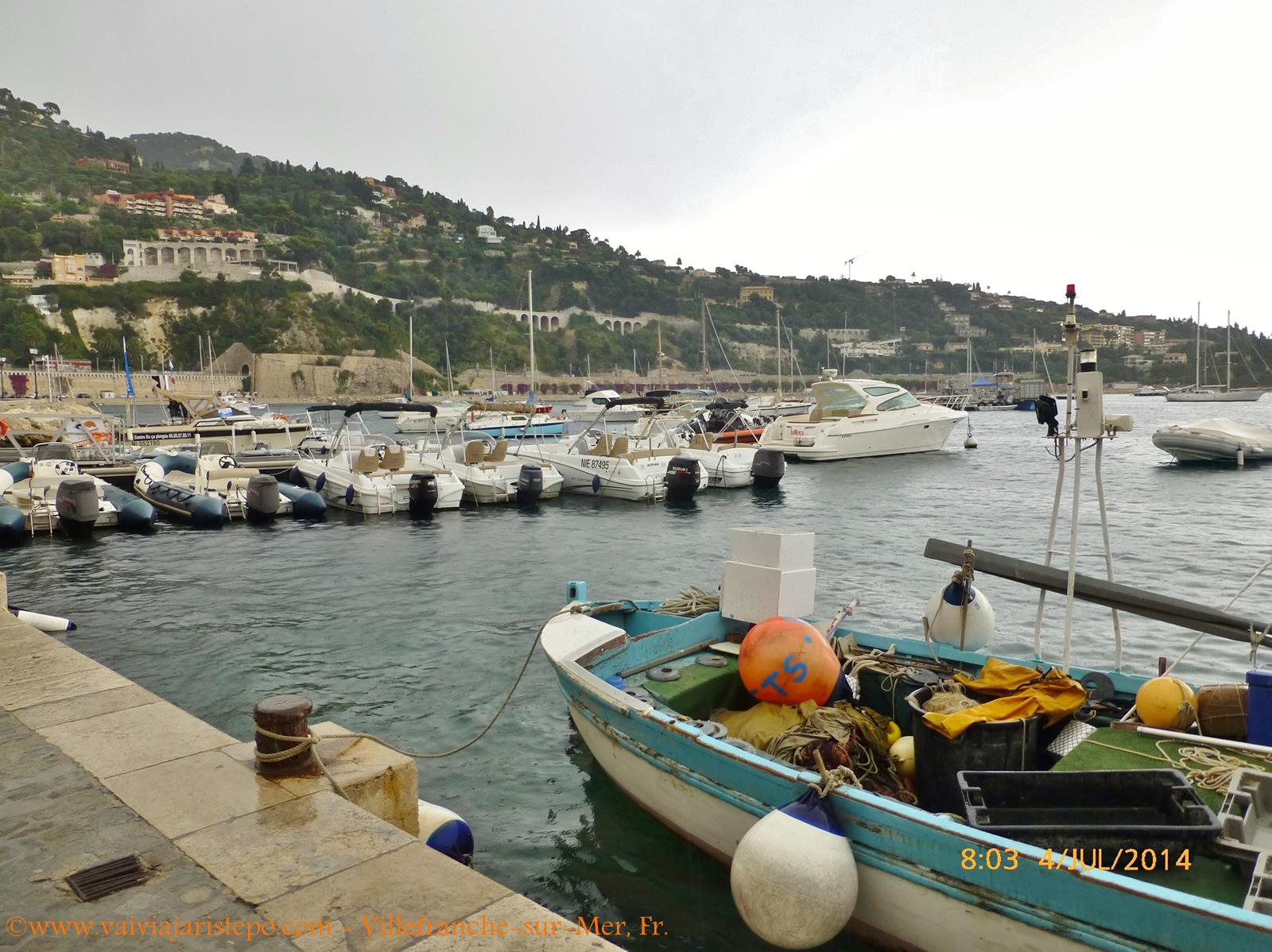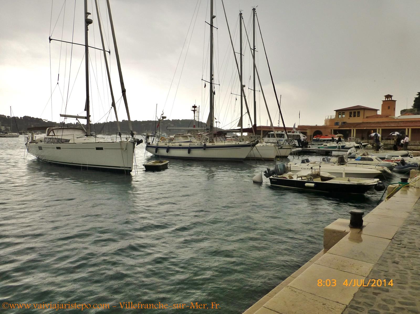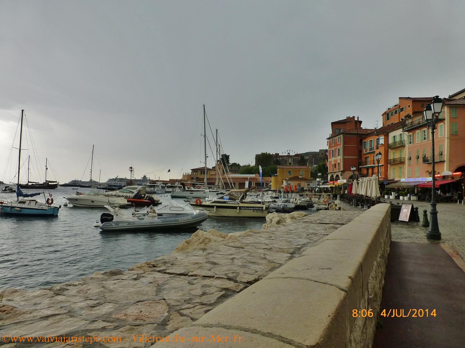 Villefranche-sur-Mer conta com um porto chamado La Darse, que não aparece nas fotos. Segundo nossas guias, a profundidade do mar é muito grande nessa área, o que resulta na ancoragem de grandes transatlânticos afastados do cais. Por isso o porto utiliza balsas para transportar os passageiros.