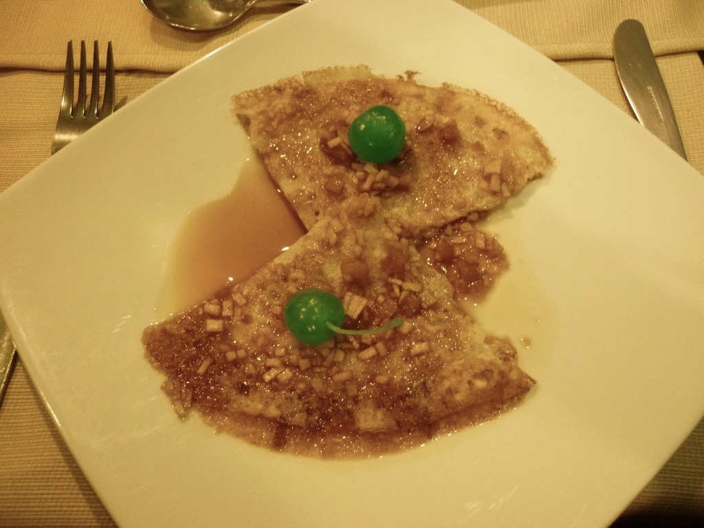 Sobremesa: as panquecas com calda de frutas vermelhas estavam doces demais.