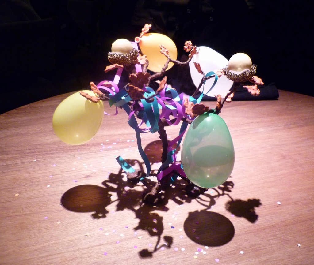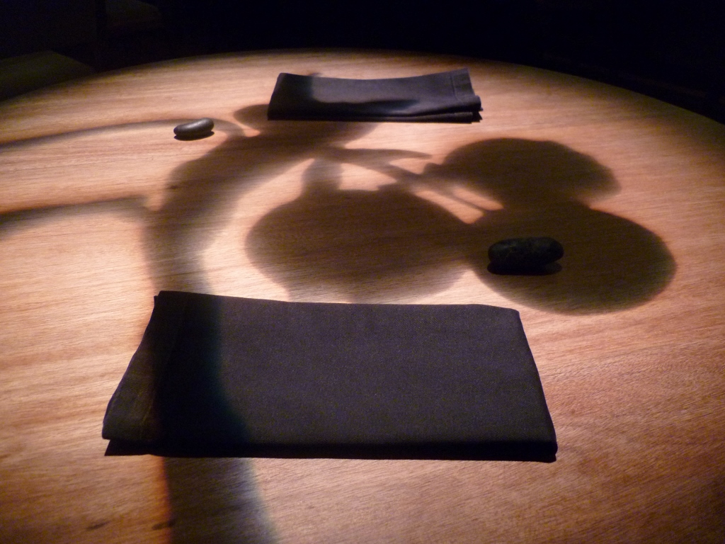 Sobre nossa mesa a projeção de um galho frutificado dava-nos boas-vindas – pura poesia. Os lugares eram marcados com pedras em frente a cada cadeira.