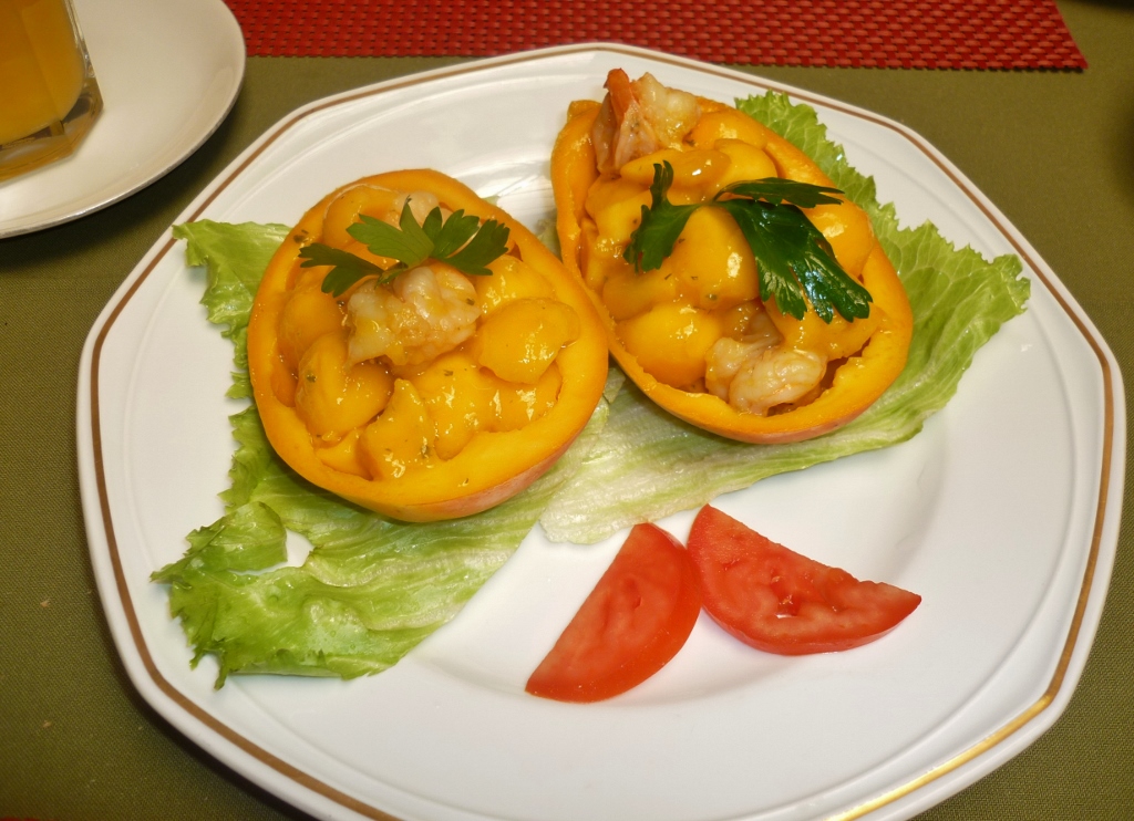 Como entrada, manga com camarões. E como pratos principais: camarões com molho levemente adocicado com côco e peito de frango com molho de amêndoas.